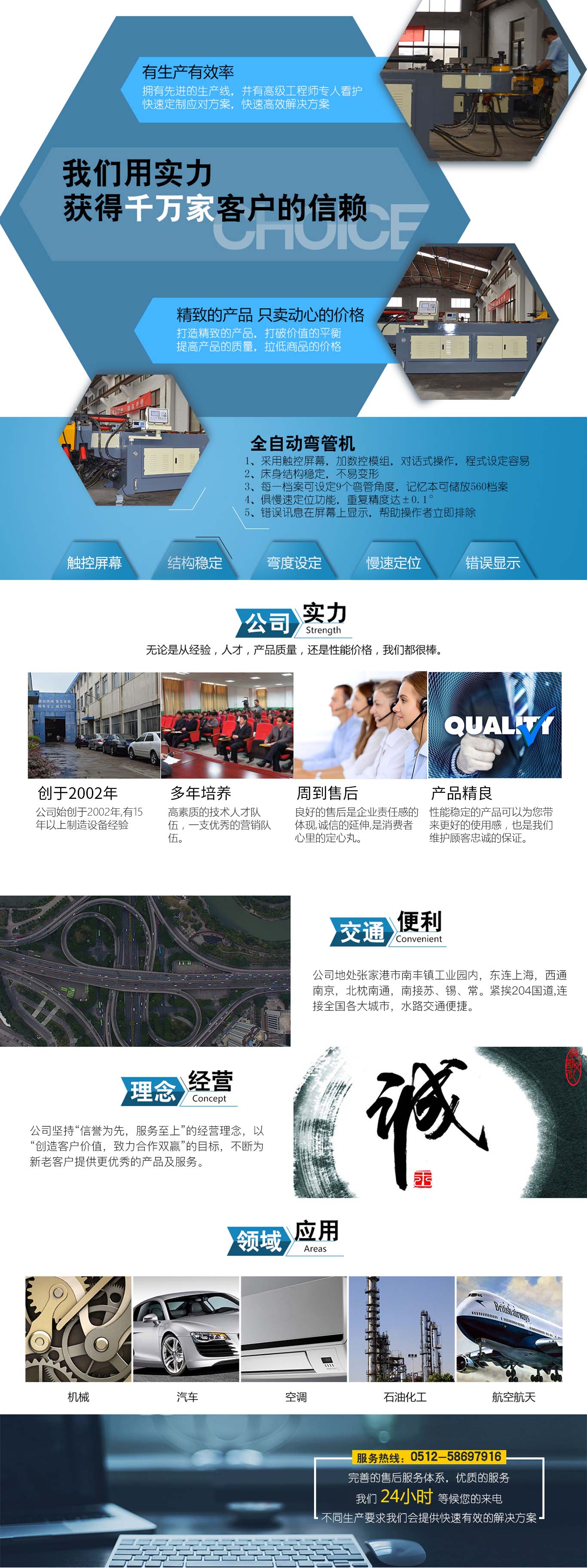 張家港市雙和機(jī)械制造有限公司始建于2001年,占地面積12000平方米,南鄰蘇州、無錫、上海,東鄰常州、南京,交通便利,位長三角中間地段,風(fēng)景優(yōu)美的張家港。 雙和公司至創(chuàng)立開始,引進(jìn)了國外的設(shè)計(jì)制造理念,組建了企業(yè)生產(chǎn)管理優(yōu)秀團(tuán)隊(duì),致力于管材加工機(jī)械研發(fā)、設(shè)計(jì)、制造。創(chuàng)新的設(shè)計(jì)理念,嚴(yán)格的質(zhì)量把關(guān),專業(yè)的售后服務(wù),不斷提升了我在整個(gè)行業(yè)的影響力。 雙和公司生產(chǎn)的系列產(chǎn)品分為彎管機(jī)、切管機(jī)、縮管機(jī)、磨齒機(jī)、伺服彎管機(jī)、數(shù)控彎管機(jī)、液壓彎管機(jī)、自動(dòng)切管機(jī)、管端成型機(jī)、倒角機(jī)、大弧滾圓機(jī)、鋁切機(jī)、壓彎機(jī)等管材加工機(jī)械,廣泛用于航天業(yè)、造船業(yè)、汽車制造、鍋爐制造、自行車、摩托車、體育健身器材、管制品家...